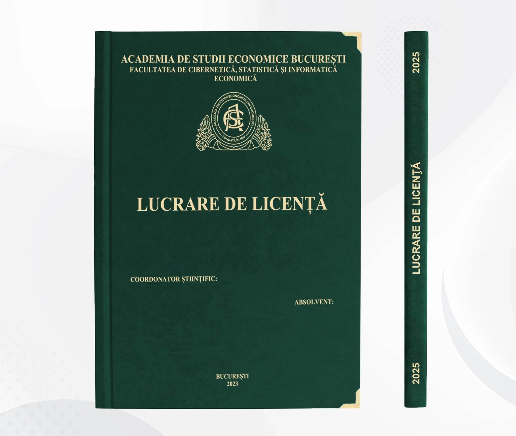 Nume, titlu și an universitar aplicate cu folio auriu sau argintiu, siglă folio sau 3D