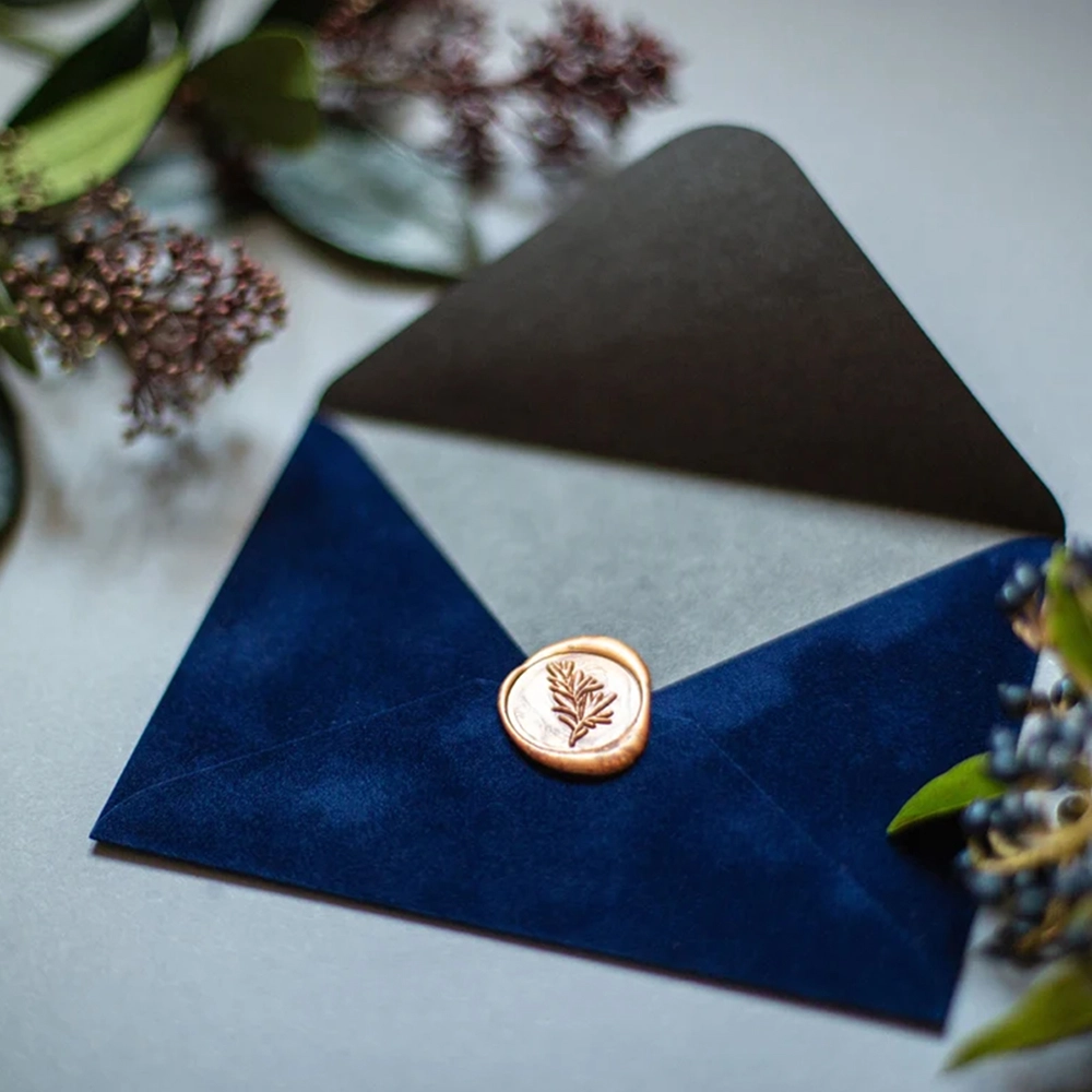 Pentru un plus de rafinament, poți sigila plicul cu un sigiliu de ceară ales în ton cu nuanța catifelei sau cu tema invitației.