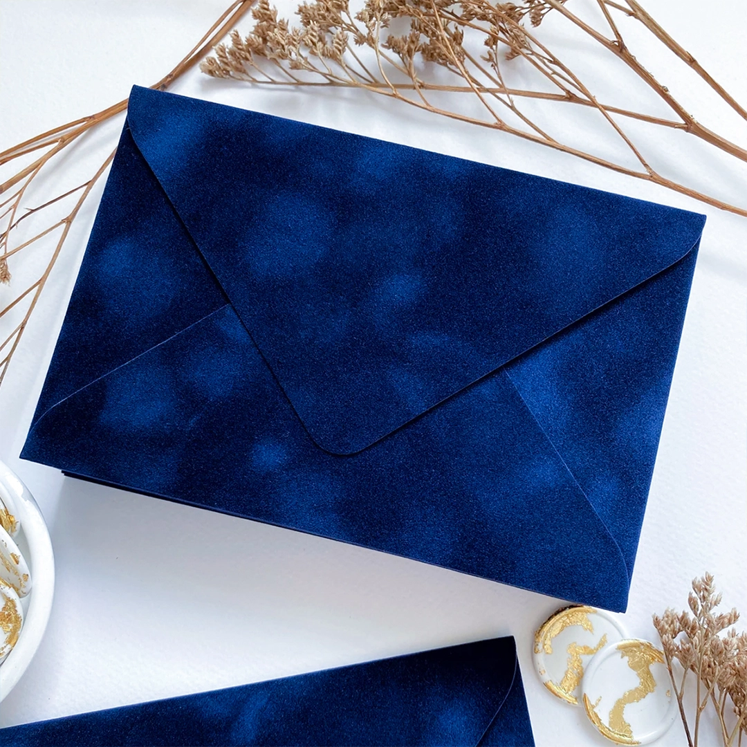Alege să oferi invitațiilor tale un plus de stil cu plicuri din catifea albastru royal, realizate manual și create special pentru evenimente elegante. Fiecare plic este confecționat din catifea premium și evidențiază instant orice invitație.