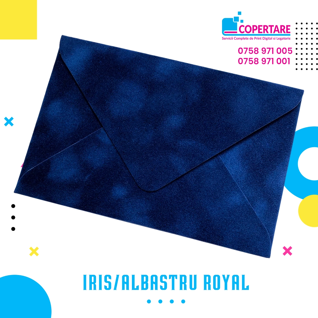 Plicuri din catifea albastru royal sunt lucrate manual, cu atenție la detalii. Materialul catifelat oferă un efect vizual deosebit, iar nuanța iris completează perfect invitațiile moderne sau clasice.