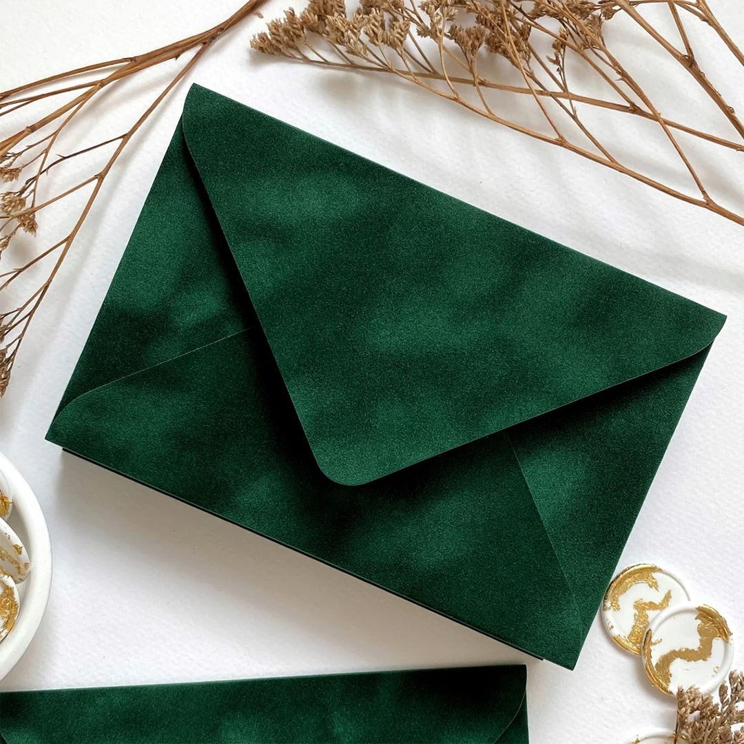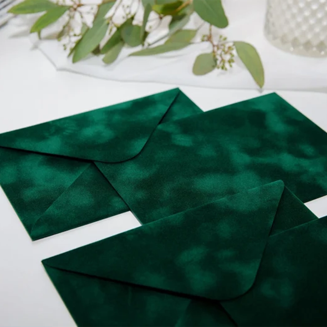 Alege să oferi invitațiilor tale un plus de stil cu plicuri din catifea forest, realizate manual și create special pentru evenimente elegante. Fiecare plic este confecționat din catifea premium și evidențiază instant orice invitație.