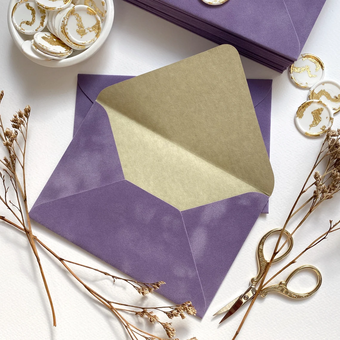 Sigiliile pun în valoare textura catifelei și transformă fiecare plic într-un element decorativ.