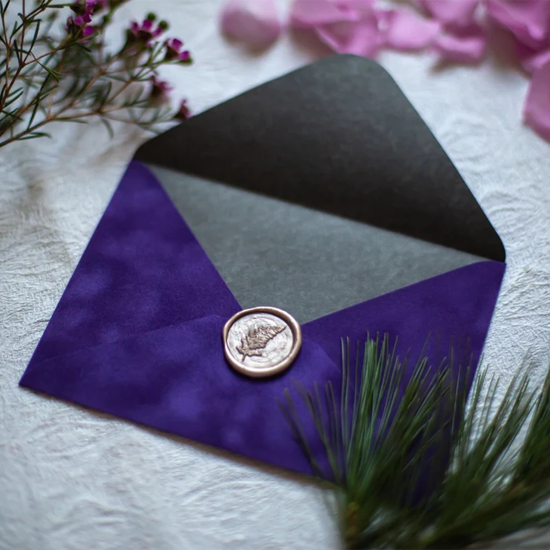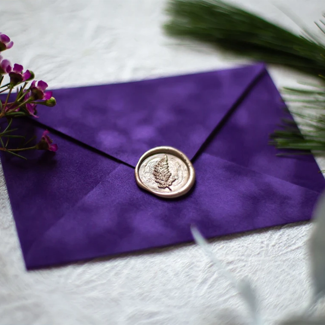 Pentru un plus de rafinament, poți sigila plicul cu un sigiliu de ceară ales în ton cu nuanța catifelei sau cu tema invitației.