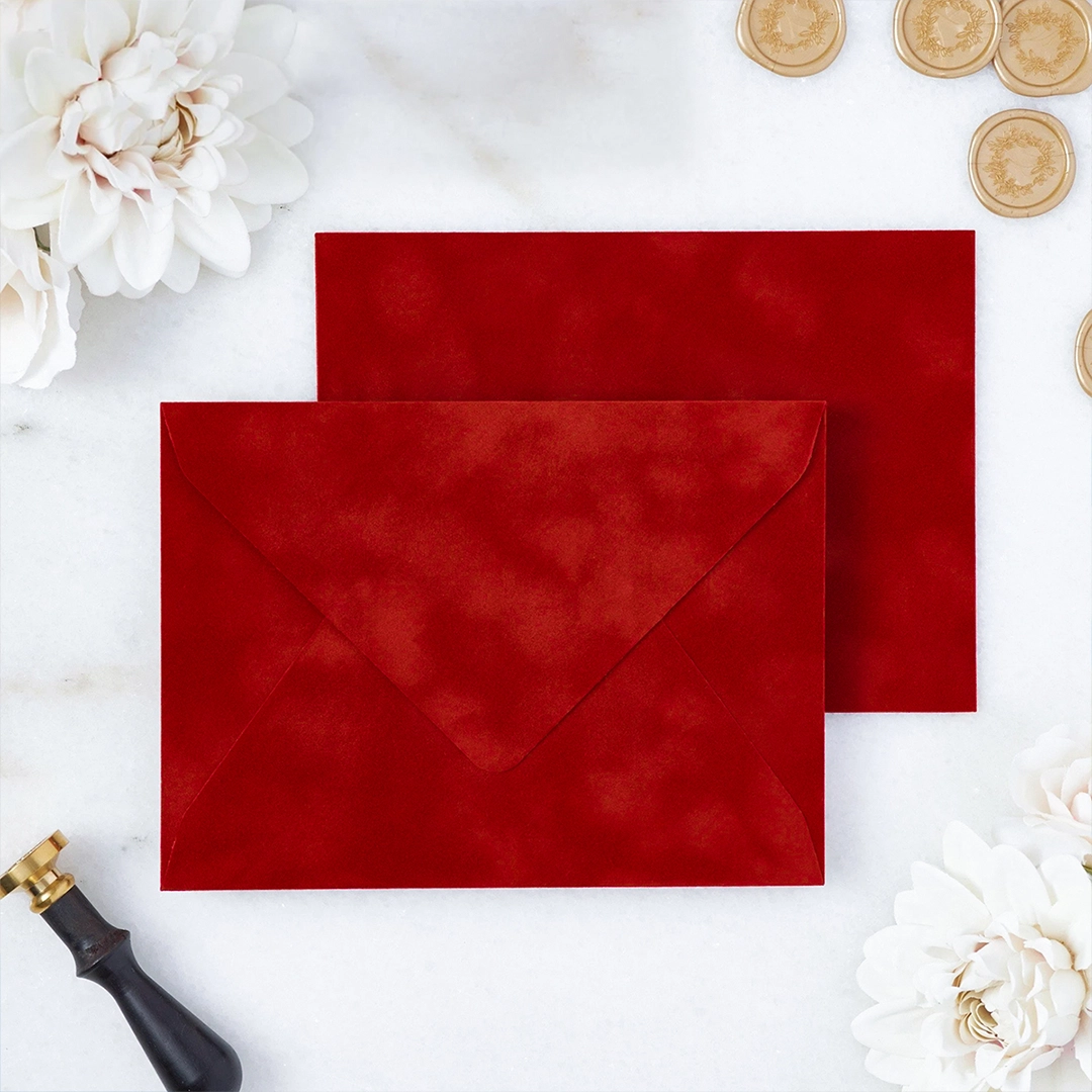 Textura fină și aspectul luxos fac ca plicurile din catifea roşu să fie alegerea ideală pentru nunți, botezuri sau evenimente rafinate.